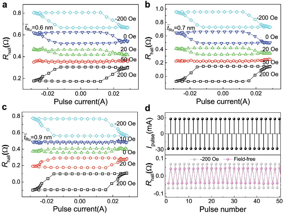 实验结果表明(如图2所示),无磁场磁矩翻转和SOT有效场的大小依赖于交换场梯度(Ru的厚度)的大小。其稳定性和可靠性也在连续翻转测试中得到证实。