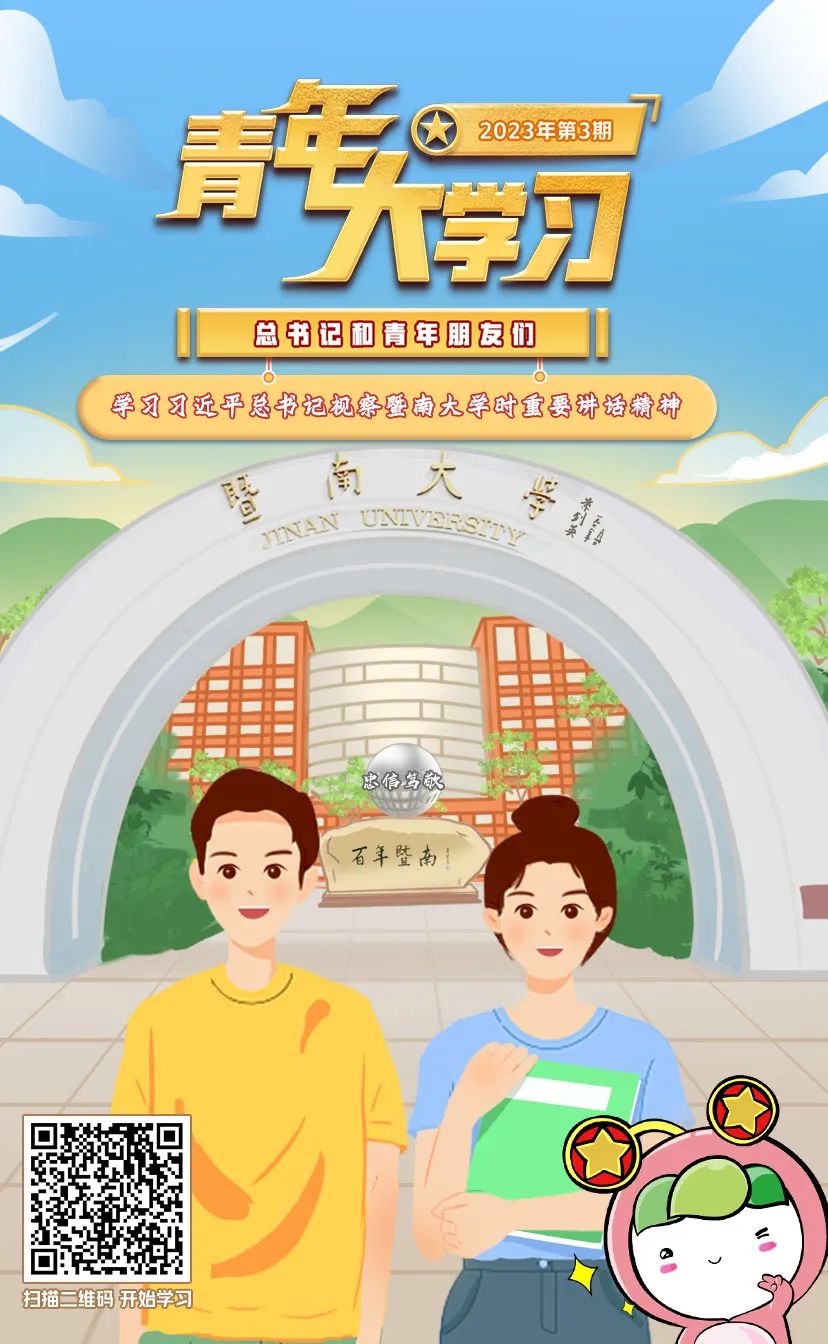 中华优秀传统文化是中华民族的精神命脉,是涵养社会主义核心价值观的重要源泉,也是我们在世界文化激荡中站稳脚跟的坚实根基。始终坚持以中华民族优秀传统文化培养造就人才的暨南大学,积极贯彻“面向海外,面向港澳台”的办学方针,弘扬“忠信笃敬、知行合一、自强不息、和而不同”的暨南精神,努力把中华优秀传统文化传播到五湖四海。2018年10月24日,习近平总书记到暨南大学视察时深切指出,希望暨南大学坚持自己的办学特色,把学校办得更好,为海外侨胞回祖国学习、传承中华文化创造更好条件。同时,总书记还勉励同学们,“好好学习、早日成才,为社会作出贡献,把中华优秀传统文化传播到五湖四海”。习近平总书记的亲切关怀和深切勉励让广大同学深受鼓舞、倍感振奋,大家纷纷表示要牢记总书记的嘱托,坚定文化自信,更加昂扬地迈向社会主义现代化国家建设新征程。本期青年大学习,我们来到暨南大学,一起学习领悟习近平总书记的关怀勉励和殷切期望!