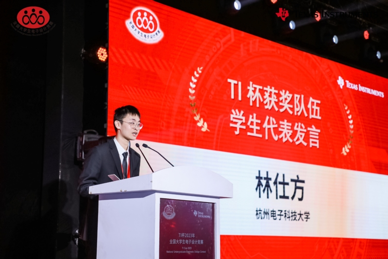我校全国一等奖获奖代表胡宇轩等11人上台领奖,杨晋伟、林仕方、张慧捧起TI杯,林仕方作为获奖学生代表在大会上发言。此外,浙江赛区继2021年后再次荣获赛区优秀组织奖。