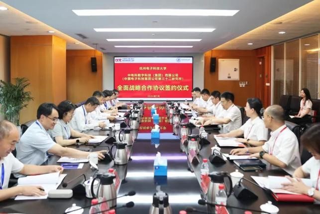 7月5日,我校与32所举行全面战略合作签约仪式。校党委书记吴卿,电科数字党委书记、董事长,32所党委书记江波出席并见证签约。据了解,我校与32所于2018年签订战略合作协议以来,取得了一系列合作成果,为深化合作奠定了坚实基础。面向未来,双方将在科技创新、人才培养、科技成果转化、应用及技术交流等领域迈出坚实步伐,共同开启校企合作新篇章。我校副校长马国进、32所副所长柴小丽代表双方签署战略合作协议。