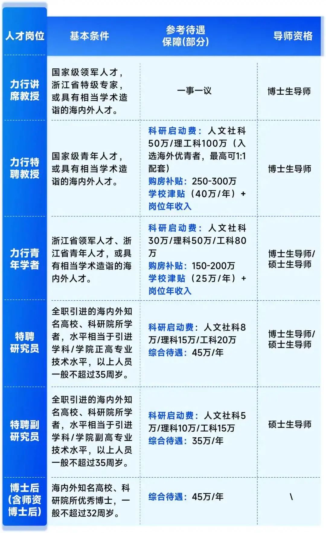 引才岗位包括力行*教授、力行特聘教授、力行青年学者、特聘研究员、特聘副研究员、博士后等。学校为引进的高层次人才提供丰厚的薪酬和福利,提供科研启动费、住房及购房补助、协调子女入学、安置家属工作等保障。力行*教授待遇面议,团队引进或特殊人才待遇可“一事一议”。