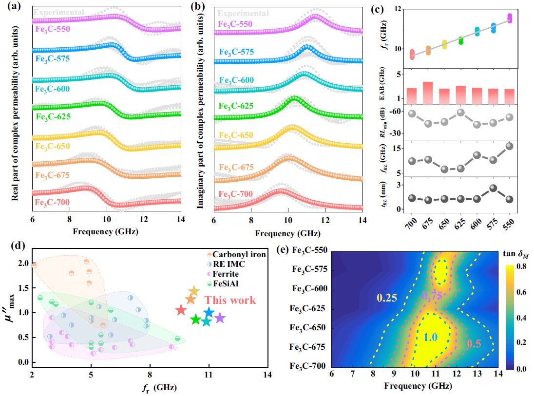 图3.磁损耗性能。6-14 GHz频段范围内的复磁导率(a)实部和(b)虚部。灰色线条为实验测得的数据,彩色线条通过LLG方程拟合获得。(c)不同温度等温淬火下的铁磁共振频率、有效吸收带宽、反射损耗和Fe3C微米片厚度。(d)对比不同软磁材料的铁磁共振频率和复磁导率虚部。(e) Fe3C微米片在6-14 GHz频段范围内的磁损耗角。