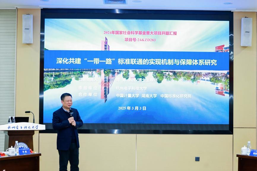 3月3日,国家社会科学基金重大项目“深化共建‘一带一路’标准联通的实现机制与保障体系研究”开题报告会成功举办。浙江省社科联党组成员、副主席陈先春,浙江省社科联规划处处长蔡青,我校副校长颜成钢等领导出席开题报告会。专家组由浙江大学社科部主任、浙江省特级专家吴晓波教授,浙江工商大学校长王永贵教授,浙江省经济与信息厅原副厅长、一级巡视员厉敏教授,湖南工商大学副校长侯俊军教授,华南理工大学朱桂龙教授,中国科学院大学陈凯华教授等组成。项目首席专家、我校副校长周青教授,课题负责人、中国计量大学宋明顺教授,课题负责人、湖南大学曾德明教授,课题负责人、中国标准化研究院康键研究员,课题负责人、我校杨伟教授,我校浙江省信息化发展研究院首席专家陈畴镛教授以及其他项目组成员60余人参加报告会。