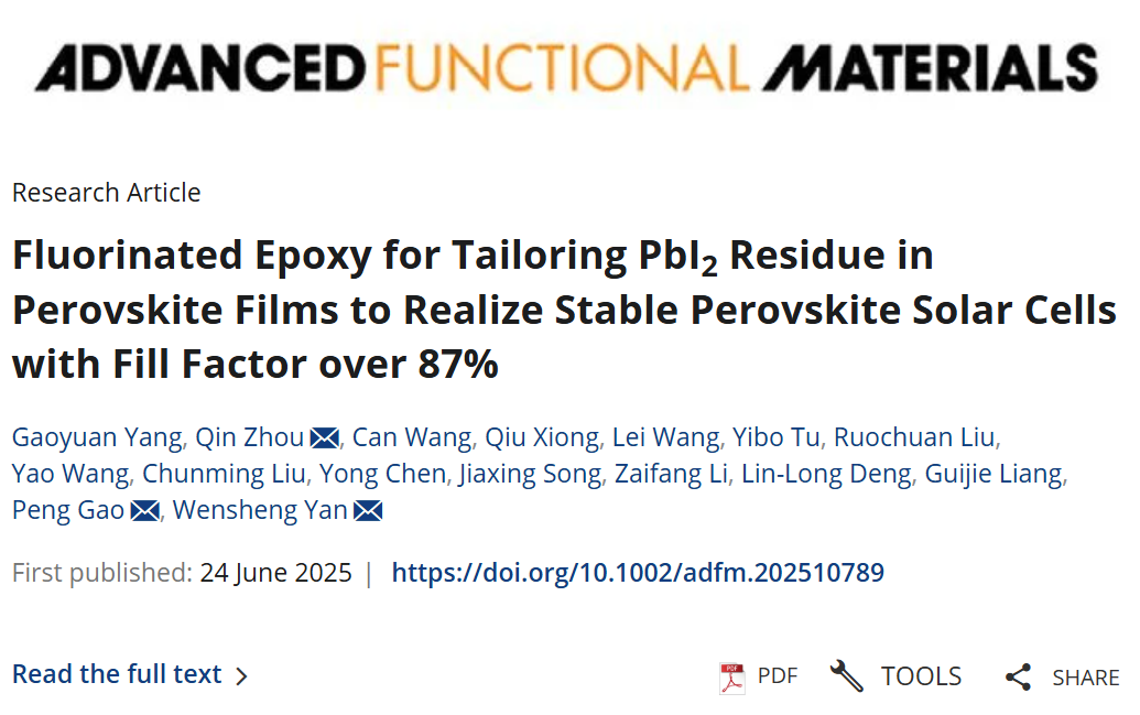 近日,我校电子信息学院能源电子团队(严文生教授)的研究生杨高元同学以第一作者在国际顶刊Advanced Functional Materials连续发表两篇高水平研究论文。第一篇论文发表于6月24日,题目为“Fluorinated Epoxy for Tailoring PbI2 Residue in Perovskite Films to Realize Stable Perovskite Solar Cells with Fill Factor over 87%”。第二篇论文发表于6月27日,题目为“Constructing Stabilized Buried Interface via a Robust Molecule Bridge for High-Performance Perovskite Photovoltaics”。在这两篇研究论文中,久久精品一区二区电子信息学院&杭电碳中和新能源研究院为第一单位。其中,周勤特聘副教授、严文生教授和中国科学院福建物质结构所高鹏研究员为论文通讯作者。