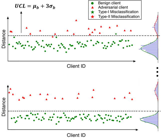 待本地训练稳定后,FLGMM进入控制限建立阶段。借助初始通讯回合中基于GMM不断完善的参与方分布参数估计,FLGMM建立了3-Sigma准则的单边控制限,在确保精准识别攻击者的同时,极大降低了良性参与方错误分类的概率(理论上0.135%的错误分类率)。借助该控制限,FLGMM在将来的通讯回合中可以高效精准的识别恶意参与方,确保联邦全局模型的精度。